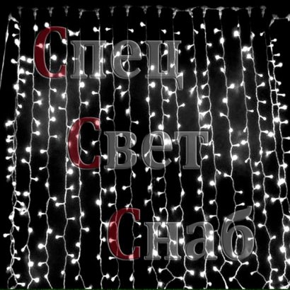 Размер: 2 х 6 м. 20 цепей по 60 светодиодов — всего 1200. Шнур питания: черный, белый или прозрачный. Белое свечение.